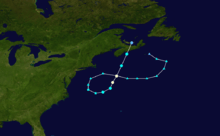 By around 14:00 UTC on November 1, an eye feature was forming, and the tropical cyclone reached its peak intensity with maximum sustained winds of 75 mph (121 km/h);[10][11] these estimates, combined with reports from an Air Force Reserve Unit flight into the storm and confirmation that a warm-core center was present, indicated that the system had become a Category 1 hurricane on the Saffir–Simpson Hurricane Scale. The hurricane accelerated toward the northeast and quickly weakened back into a tropical storm. It made landfall near Halifax, Nova Scotia, at 14:00 UTC on November 2 with sustained winds of 45 mph (72 km/h). While the storm was approaching the coast, weather radars depicted curved rainbands on the western side of the system.[8] After crossing over Prince Edward Island,[6] The storm fully dissipated late on November 2.[8]