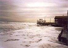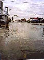 In New York and northern New Jersey, the storm system left the most coastal damage since the 1944 Great Atlantic hurricane. Numerous boats were damaged or destroyed, killing two people off Staten Island. High winds swept a man off a bridge, killing him.[1] High waves flooded the beach at Coney Island. In Sea Bright, New Jersey, waves washed over a seawall, forcing 200 people to evacuate.[4] Further inland, the Hudson, Passaic, and Hackensack rivers experienced tidal flooding.[2] Outside Massachusetts, damage was heaviest in southern New Jersey, where the cost was estimated at $75 million (1991 USD). Across the area, tide heights reached their highest since the 1944 hurricane, leaving severe coastal and back bay flooding and closing many roads. The storm caused significant beach erosion,[1] with 500,000 cubic yards (382,000 cubic meters) lost in Avalon, as well as $10 million damage to the beach in Cape May. The presence of a dune system mitigated the erosion in some areas.[24] There was damage to the Atlantic City Boardwalk.[4] Fire Island National Seashore was affected, washing away an entire row of waterfront houses in towns like Fair Harbor. Following the storm, there was a moratorium on clamming in the state's bays, due to contaminated waters.[24] Along the Delmarva Peninsula, there was widespread water damage to homes, including ten affected houses in Sandbridge Beach, Virginia. Tides in Ocean City, Maryland, reached a record height of 7.8 ft (2.4 m), while elsewhere the tides were similar to the Ash Wednesday Storm of 1962.[1]