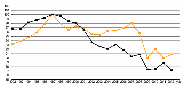 The following figure compares the 1996-1999 period with the 2013-2015 period, in terms of Japan's real GDP. During the 1996-1999 period, the VAT was raised from 3 per cent to 5, and during the 2013-2015 period, the VAT was raised from 5 to 8. For the 1996-1999 period, the GDP of the first quarter of 1996 is set 100. For the 2013-2015 period, that of Q1 of 2013 is 100. The interval of the horizontal axis is one quarter, and the quarters when the VAT were raised are set zero. And therefore, the GDPs of Q1 1996 and of Q1 2013 correspond to values evaluated at quarter -5.