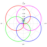 The spatial resolution of first-order Ambisonics as described above is quite low. In practice, that translates to slightly blurry sources, but also to a comparably small usable listening area or sweet spot. The resolution can be increased and the sweet spot enlarged by adding groups of more selective directional components to the B-format. These no longer correspond to conventional microphone polar patterns, but rather look like clover leaves. The resulting signal set is then called Second-, Third-, or collectively, Higher-order Ambisonics.