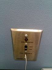 A bathroom emergency pullstring is a cord found in some bathrooms and restrooms that can be pulled in the event of an emergency suffered by the bathroom's user, such as a fall or lock-in. They are often found in the bathrooms of healthcare facilities, such as hospitals, nursing homes, assisted livings, and doctor's offices, in places frequented by senior citizens or disabled people, such as senior centers, places of worship, or in senior housing, and in other places where trouble may arise, such as the lavatories on aircraft or trains and in hotels.[1] These pull cords are part of a communication system, whereas, when pulled, a light outside the bathroom flashes, which notifies a nurse or someone who is around to help the person in need. In addition to the flashing light, a buzzer or tone can be heard. Ideally, they are placed near the toilet or shower.[2]