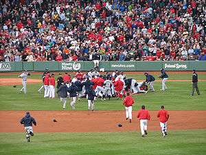 A bench-clearing brawl, sometimes known as a basebrawl or a rhubarb, is a form of ritualistic fighting that occurs in sports, most notably baseball and ice hockey, in which every player on both teams leave their dugouts, bullpens, or benches and charge the playing area in order to fight one another or try to break up a fight.