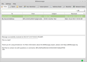 - ↑ "Bitmessage Timeservice Broadcast". July 15, 2013. Retrieved 2013-07-15.