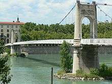 The first bridge, the bridge of the Hôtel-Dieu or Hospital, was built in 1837–1839 by the contractor Clauzel, on behalf of the company of bridges of the Rhone. This was a suspension bridge with a length of 210 m (689 ft), based on solid concrete piers, protected by riprap.