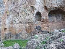 The Roman fountain dates to the 1st century B.C. and is situated about 50 meters higher from the Archaic one. Niches carved on the rock were intended for the ex votos of the pilgrims. One of them was later transformed into a church of St. John the Baptist. The water of the spring reached the fountain with a closed aqueduct. On the facade of the fountain there were seven bronze spouts. In front of it there was a paved courtyard with stone benches on its three sides. [2] [3]