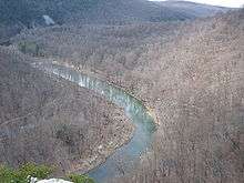 Caudy's Castle is a rock pinnacle of Ridgeley (Oriskany) sandstone that stands 1,070 feet (326 m) above sea level over the Cacapon River near the Bloomery Pike (West Virginia Route 127) south of Forks of Cacapon in Hampshire County, West Virginia. The rock formation is named after James Caudy, an early Hampshire County pioneer and settler who fought off an attack by fifteen Native Americans from the rock during the French and Indian War.[1] Caudy's Castle is also known as the Castle Rock. The pillar lies on the southern end of its namesake, Castle Mountain.