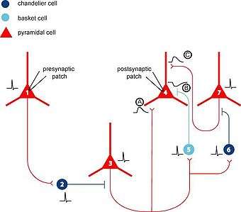 An action potential in a pyramidal neuron (cell 1) elicits a spike in a chandelier cell (2) via a strong connection, in turn evoking a third-order spike in a downstream pyramidal cell (3). This spike results in a trisynaptic EPSP being recorded in a postsynaptic pyramidal cell (cell 4, event A). At the same time, cell 3 drives both a basket cell (5) and chandelier cell (6) to threshold. The basket cell evokes a hyperpolarizing IPSP on the postsynaptically recorded pyramidal cell (cell 4, event B), four synapses removed from the original spike. The spiking chandelier cell (6) triggers yet another pyramidal neuron to fire (7), which produces an EPSP on the recorded neuron (cell 4, event C), five synapses away from the original spike. The result seen in the postsynaptic pyramidal neuron (cell 4) is a delayed EPSP-IPSP-EPSP sequence (events A, B, and C), traveling through three, four, and five synapses respectively. Molnár et al. propose[2] that polysynaptic pathways similar to this one can be activated by a single action potential in a cortical pyramidal cell.