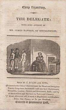The individual tracts have a complex bibliographical history often going through many editions and involving several different individuals who were designated 'Printer to the Cheap Repository,' together with many distributors and publishers. Retail sales were made by 'booksellers, newsmen, and hawkers, in town and country.'[7] The most important printers involved were Samuel Hazard of Bath; John Marshall of London, William Watson of Dublin; and John Evans of 42 Long Lane, London. Several copies were also reprinted in the U.S.A. by printers in both New York and Philadelphia. Until the end of 1798 the publisher undertaking the work was 'The Cheap Repository', but thereafter the copyrights of the official tracts were sold and later collected editions were published by John and James Rivington (publishers) for the Society for Promoting Christian Knowledge (S.P.C.K.)