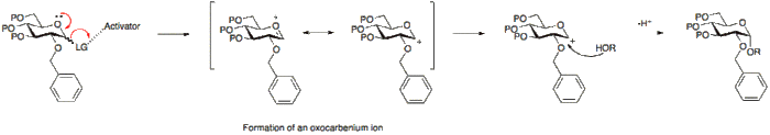 An activator is commonly a Lewis acid which enables the leaving group at the anomeric position to leave and results in the formation of the oxocarbenium ion.