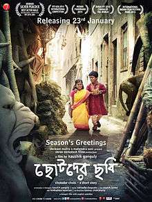 Chotoder Chobi (English: A Story about small people) is a 2015 Indian Bengali language short film directed by Kaushik Ganguly. The film stars Dulal Sarkar and Deblina Roy in the lead roles. The film is directed by Ganguly and follows his earlier work on Laptop, Shabdo, Apur Panchali and Khaad. The plot revolves around the lives and opinions of a group of dwarfs who work as jokers in a circus.[2] The film was released on 23 January 2015.[3] Produced by Shrikant Mohta of Shree Venkatesh Films, the film's music was scored by Indradeep Dasgupta.[4] The main cast as well as supporting actors were previously non-actors but Sarkar, one of the lead actors in the film, was awarded the best actor award at the 45th International Film Festival of India.[3][5]
