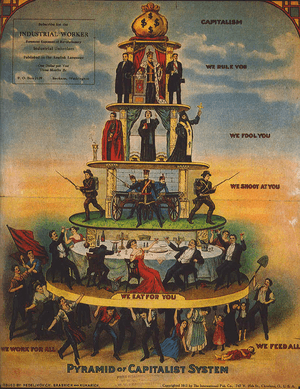 The typical example of class conflict described is class conflict within capitalism. This class conflict is seen to occur primarily between the bourgeoisie and the proletariat, and takes the form of conflict over hours of work, value of wages, division of profits, cost of consumer goods, the culture at work, control over parliament or bureaucracy, and economic inequality. The particular implementation of government programs which may seem purely humanitarian, such as disaster relief, can actually be a form of class conflict.[9] In the USA class conflict is often noted in labor/management disputes. As far back as 1933 representative Edward Hamilton of ALPA, the Airline Pilot's Association, used the term "class warfare" to describe airline management's opposition at the National Labor Board hearings in October of that year.[10] Apart from these day-to-day forms of class conflict, during periods of crisis or revolution class conflict takes on a violent nature and involves repression, assault, restriction of civil liberties, and murderous violence such as assassinations or death squads. (Zinn, People's History)