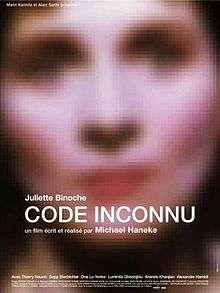 Code Unknown (French: Code inconnu : Récit incomplet de divers voyages; English: Code Unknown: Incomplete Tales of Several Journeys) is a 2000 film directed by Michael Haneke. Most of the story occurs in Paris, France, where the fates of several characters intersect and connect.