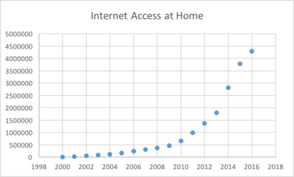 The sole internet service provider is EthioTelecom. There are about 4,300,000 people who can access internet at their home.[8] It is harder to estimate the number of people who access the internet through internet café's which are much more popular and affordable.