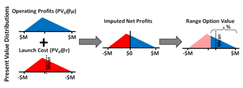 An approximate but conservative option value, termed the DM Range Option, can be estimated simply using range estimates of the present values of operating profit and launch costs.[7] Fig. 3. As described, a range is an estimate of a maximum, most-likely (or mode) and minimum (or Optimistic, Most-Likely, Pessimistic) values that circumscribe a triangular distribution. The two distributions are then combined, and, similar to the approach for simulation described, the expected value is the first moment of all positive NPVs. Here, using equations from triangular distributions, the mean of the launch cost distribution is calculated. The present value imputed net profit distribution is the difference between the operating profit distribution and the mean value of the launch cost distribution. In one implementation, the approximate option value is the product of the mean and the probability of the payoff distribution right triangle, the positive value right tail. The DM Range Option requires no simulation. This approach is useful for early-stage estimates of project option value when there has not been sufficient time or resources to gather the necessary quantitative information required for a complete cash flow simulation, or in a portfolio of projects when simulation of all the projects is too computationally demanding.[8] If the launch cost is a scalar value, then the range option value calculation is exact. The range option method is similar to the fuzzy method for real options.