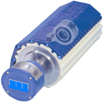 The drum motor comprises an asynchronous or synchronous electric motor, or hydraulic motor fixed to a stationary shaft at one end of the drum and directly coupled through the motor’s rotor pinion to an in-line helical or planetary gearbox which is fixed to the other stationary shaft. The torque is transferred from the motor via the gearbox to the drum shell through a coupling or geared rim attached to the shell or end housing (see photo inset above)