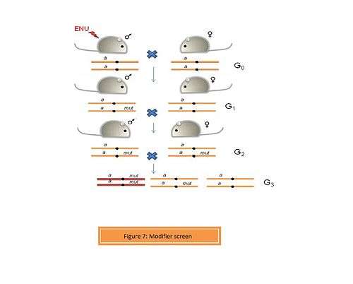 A modifier such as an enhancer or suppressor can alter the function of a gene. In a modifier screen, an organism with a pre-existing phenotype is selected. Thus, any mutations caused by the mutagen (ENU) can be assessed for their enhancive or suppressive activity.[7] Screening for dominant and recessive mutations is performed in a way similar to the conventional genome-wide screen (Figure 7). A number of modifier screens have been performed on Drosophila. Recently, Aliga et al. performed a dominant modifier screen using ENU-induced mice to identify modifiers of the Notch signaling pathway.[8] Delta 1 is a ligand for the Notch receptor. A homozygous loss-of-function of Delta 1 (Dll1lacZ/lacZ) is embryonically lethal. ENU-treated mice were crossed to Dll1lacZ heterozygotes. 35 mutant lines were generated in G1 of which 7 revealed modifiers of the Notch signaling pathway.
