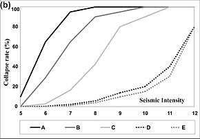 The probability that a building of a given type may collapse if subjected to a certain intensity of shaking (Figure 5) is an important parameter for calculating expected human losses. The weak buildings that are present in developing countries (Figure 4 on the left) are the ones that are likely to collapse at moderate intensities (Figure 5 on the left).