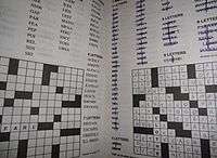 Fill-Ins, also known as Fill-It-Ins or Word Fills, are a variation of the common crossword puzzle in which words, rather than clues, are given.[1][2][3][4] Fill-Ins are common in puzzle magazines along with word searches, cryptograms, and other logic puzzles.[5] Some consider Fill-Ins to be an easier version of the crossword.[6] Since the Fill-In requires no outside knowledge of specific subjects,[7] one can solve the puzzle in another language.[3]