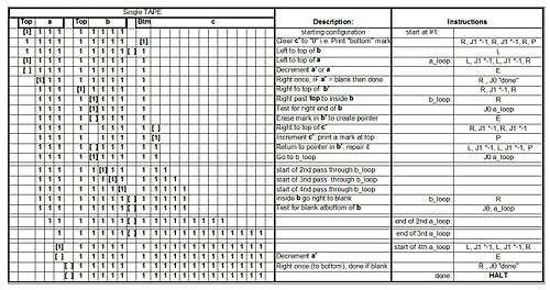 An example of "multiply" a × b = c on a Post–Turing machine. At the start, the tape (shown on the left) has two numbers on it – a' = 3' (4 marks), b' = 4' (5 marks). (A single mark would represent "0".) At the end the tape will have the product c' = 12' (13 marks) to the right of b. Note "top" and "bottom" are there just to clarify what the P–T machine is doing.