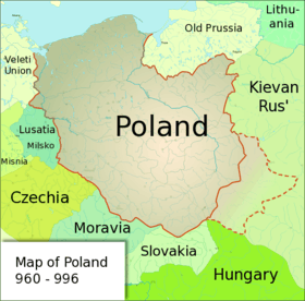 In the 10th century, the West Slavic Polan tribes under the Piast prince Mieszko I about 960 were able to establish a sovereign state around Poznań and Gniezno in an area later called Greater Poland. Mieszko's territory included Masovia beyond the Vistula river, Silesia and in 962/63 he first met with the Saxon forces of Margrave Gero, ruler of the Marca Geronis between the Saale and Bóbr rivers established in 937 by King Otto I of Germany. During the fight with Germanic duchies Mieszko I in 963 recognized Otto I as Emperor[3] In return for tribute to the newly crowned Emperor, Otto I reckognized Mieszko I as amicus imperatoris ("Friend of the Emperor") and stated that he is dux Poloniae ("Duke of Poland"). As he could not prevail against Gero, Mieszko I resorted to consolidate his realm: he strengthened the relations with the Bohemian duke Boleslaus I by marrying his daughter Dobrawa and converted to Christianity in 966. The next year however, he once again entangled with the troops of the Saxon renegade Wichmann the Younger, fighting over the island of Wolin on the Baltic coast. He also had to defend the Polish border on the lower Oder river against the forces of Margrave Odo I of Lusatia at the 972 Battle of Cedynia.