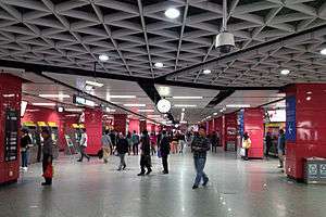 Guangzhou Railway Station Station (Chinese: 广州火车站) is an interchange station of Line 2 and Line 5 of the Guangzhou Metro.[1] It is located at the underground of the west square of Guangzhou Railway Station, located at the junction of Huanshi Road West (Chinese: 环市西路; pinyin: Huanshi Xilu and Renmin Road North (Chinese: 人民北路; pinyin: Renmin Beilu) in Yuexiu District. It started operations on December 29, 2002, (Line 2) and December 2009 (Line 5) respectively. Its area is about 10000 square metres and it is the second largest metro station in Guangzhou.[2][3][4]