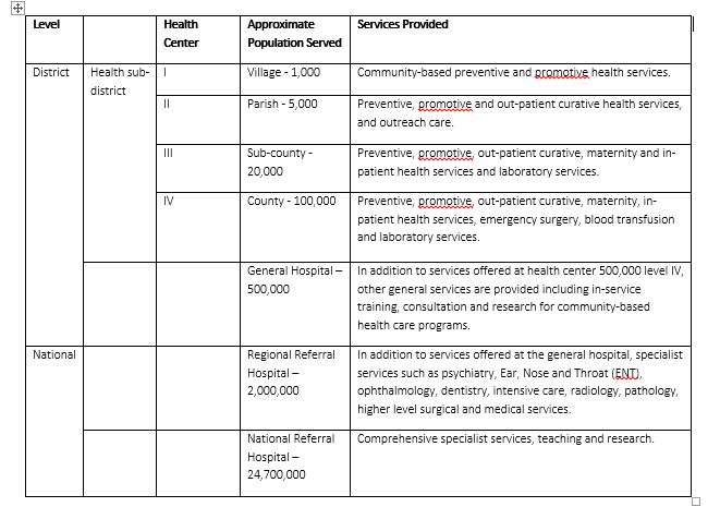 Uganda’s health system is divided into national and district-based levels. At the national level are the national referral hospitals, regional referral hospitals, and semi-autonomous institutions including the Uganda Blood Transfusion Services, the National Medical Stores, the Uganda Public Health Laboratories and the Uganda National Health Research Organization (UNHRO).[6]