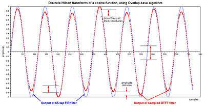 Figure 5 is an example of using both the IIR hilbert() function and the FIR approximation. In the example, a sine function is created by computing the Discrete Hilbert transform of a cosine function, which was processed in four overlapping segments, and pieced back together. As the FIR result (blue) shows, the distortions apparent in the IIR result (red) are not caused by the difference between h[n] and hN[n] (green and red in Fig 3). The fact that hN[n] is tapered (windowed) is actually helpful in this context. The real problem is that it's not windowed enough. Effectively, M = N, whereas the overlap-save method needs M < N.