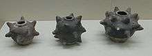 The first concerted Mongol invasion of Jin occurred in 1211 and total conquest was not accomplished until 1234. In 1232 the Mongols besieged the Jin capital of Kaifeng and deployed gunpowder weapons along with other more conventional siege techniques such as building stockades, watchtowers, trenches, guardhouses, and forcing Chinese captives to haul supplies and fill moats.[31] Jin scholar Liu Qi (劉祈) recounts in his memoir, "the attack against the city walls grew increasingly intense, and bombs rained down as [the enemy] advanced."[31] The Jin defenders also deployed gunpowder bombs as well as fire arrows (huo jian 火箭) launched using a type of early solid-propellant rocket.[14] Of the bombs, Liu Qi writes, "From within the walls the defenders responded with a gunpowder bomb called the heaven-shaking-thunder bomb (震天雷). Whenever the [Mongol] troops encountered one, several men at a time would be turned into ashes."[31] A more fact based and clear description of the bomb exists in the History of Jin: "The heaven-shaking-thunder bomb is an iron vessel filled with gunpowder. When lighted with fire and shot off, it goes off like a crash of thunder that can be heard for a hundred li [thirty miles], burning an expanse of land more than half a mu [所爇圍半畝之上, a mu is a sixth of an acre], and the fire can even penetrate iron armor."[31] A Ming official named He Mengchuan would encounter an old cache of these bombs three centuries later in the Xi'an area: "When I went on official business to Shaanxi Province, I saw on top of Xi'an's city walls an old stockpile of iron bombs. They were called 'heaven-shaking-thunder' bombs, and they were like an enclosed rice bowl with a hole at the top, just big enough to put your finger in. The troops said they hadn't been used for a very long time."[31] Furthermore, he wrote, "When the powder goes off, the bomb rips open, and the iron pieces fly in all directions. That is how it is able to kill people and horses from far away."[32]