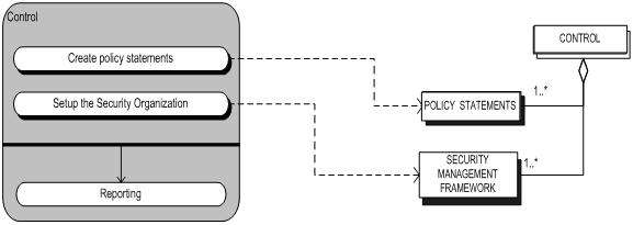 The first activity in the security management process is the “Control” sub-process. The Control sub-process organizes and manages the security management process. The Control sub-process defines the processes, the allocation of responsibility for the policy statements and the management framework.