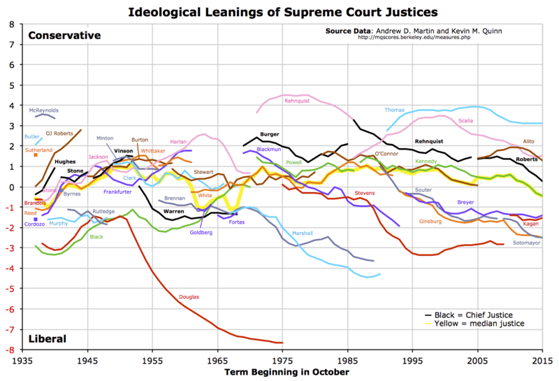Andrew D. Martin and Kevin M. Quinn have employed Markov chain Monte Carlo methods to fit a Bayesian measurement model of ideal points (policy preferences on a one-dimensional scale) for all the justices based on the votes in every contested Supreme Court case since 1937.[9][10][11][12] The graph below shows the results of their analysis: the ideological leaning of each justice from the term beginning in October 1937 to the term that began in October 2015.[13][14] Note that the scale and zero point are arbitrary—only the relative distance of the lines is important. Each unique color represents a particular Supreme Court seat, which makes the transitions from retiring justices to newly appointed justices easier to follow. The black lines represent the leanings of the Chief Justices. The yellow line represents the estimated location of the median justice—who, as Duncan Black’s median voter theorem posits, is often the swing vote in closely divided decisions.[15]