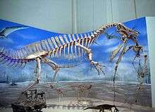 The nostrils of Irritator were shifted far to the rear of the skull, and the secondary palate make respiration possible even if the majority of the jaw was under water or held prey. In particular, the sagittal crest of Irritator is an indication for a pronounced neck musculature, which would have been necessary in order to pull the jaw closed quickly against water resistance and withdraw the head fast. Sues et al. (2002) point out, however, that there would be no reason to assume that the Spinosauridae specialized completely in fishing.[17] They stress rather that this head morphology indicates a generalistic feeding, particularly on small prey animals. In fact, portions of a young Iguanodon, a terrestrial herbivore, were found inside the fossil skeleton of one Baryonyx. Naish et al. (2004) support the theory that Irritator hunted both aquatic and terrestrial animals as a generalist within the coastal area and in addition probably also searched for carrion.[18]