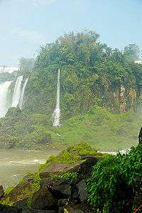 The Isla de San Martín (English: Island of San Martín) is an island located in Argentina's Iguazu River, within the Iguazu Falls[1] in Misiones Province. The island spans the 3 levels that form the falls, but only the lower and middle levels are open to visitors. The island can only be reached in small boats, unless the river is below the minimum level. Once on the island, one must climb 190 steps through three different pathways that lead to a balcony with panoramic views.