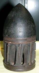 A James pattern solid shot. The “birdcage” at the base would have been covered by sheet lead which, upon firing the gun, would have expanded into the grooves of the rifling as did the lead surrounding the concavity at the breech end of the Minié ball.