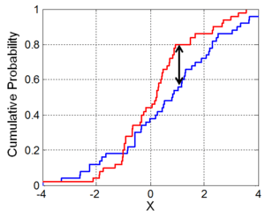 Illustration of the two-sample Kolmogorov–Smirnov statistic. Red and blue lines each correspond to an empirical distribution function, and the black arrow is the two-sample KS statistic.