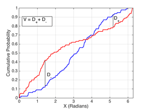 Kuiper's test[1] is closely related to the better-known Kolmogorov–Smirnov test (or K-S test as it is often called). As with the K-S test, the discrepancy statistics D+ and D− represent the absolute sizes of the most positive and most negative differences between the two cumulative distribution functions that are being compared. The trick with Kuiper's test is to use the quantity D+ + D− as the test statistic. This small change makes Kuiper's test as sensitive in the tails as at the median and also makes it invariant under cyclic transformations of the independent variable. The Anderson–Darling test is another test that provides equal sensitivity at the tails as the median, but it does not provide the cyclic invariance.