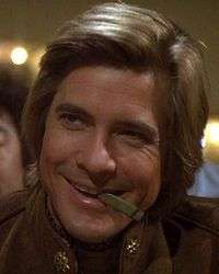 Lieutenant Starbuck of the Colonial Service, played by Dirk Benedict, is a fictional character in the 1978 science fiction television series Battlestar Galactica. Starbuck is a Viper starfighter pilot, gambler, womanizer and smoker of "fumerellos," or cigars. He is involved with Lieutenant Athena and socialator Cassiopeia, and best friend of Captain Apollo.