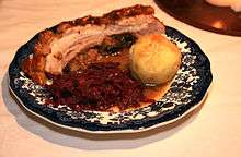 Mecklenburger Rippenbraten Main course Rib roast, made from belly of pork including meat of the upper rib, stuffed with Boskoop apples, prunes, cinnamon, rum and zwieback, usually served with Klöße or red cabbage.