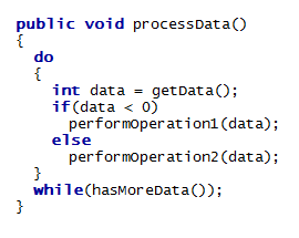 A snippet of Java code with keywords highlighted in blue and bold font