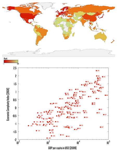 This list orders countries by their economic complexity index (ECI), as it was defined and calculated by Cesar A. Hidalgo and Ricardo Hausmann. The ECI was calculated with trade data from the UN Comtrade,[1] thus the information is only based on exports (and not goods produced). The 2009 rankings includes Products Exports Treemaps, also built by the Observatory of Economic Complexity.