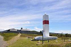 Punta Mackinlay, on Gable Island. (A.) | 54°54.7′S 67°24.9′W / 54.9117°S 67.4150°W | Fl.R. period 2s fl. 0.5s, ec. 1.5s | 31 9 6 | Red and white checkered round concrete tower; | 23. | Radar reflector. |