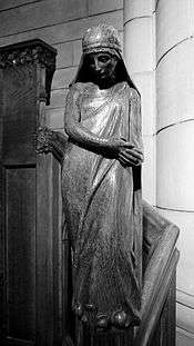 | University Of Glasgow Chapel | Glasgow, Scotland | The figures carved on the pulpit in the memorial chapel represent four Scottish saints: St Margaret, St Columba, St Bride and St Oran. The symbols associated with these saints also appear: book, dove, lamp and the Celtic cell. There is a figure on the newel-post of the pulpit stair representing the Sower who sows "the seed of the Word".[6] Photograph of newel post shown courtesy Sam Maddra. | |
