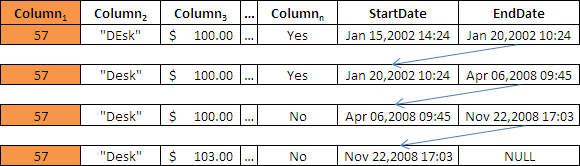 As shown above, this new table contains the same columns as the original table, and additionally two new columns of type DATETIME: StartDate and EndDate. This is known as tuple versioning. These two additional columns define a period of time of "validity" of the data associated with a specified entity (the entity of the primary key), or in other words, it stores how the data were in the period of time between the StartDate (included) and EndDate (not included).