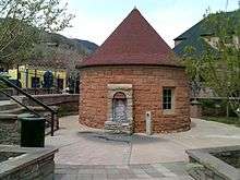 Medical practitioners, such as Dr. Edwin Solly, promoted the health benefits of the "pure air" and sunny Rocky Mountain climate as the "world's best suited therapeutic environment" for the treatment of tuberculosis.[16] He also believed in the benefits of mineral spring water which drew tourists and the infirm, particularly people with tuberculosis, to the area. Some springs were enclosed as the town grew. One of the enclosures, in red sandstone and under a "conical roofed structure", is the Cheyenne Spring House. There were more than 50 drilled wells and springs after the turn of the century. Since then, more were enclosed. After a period when the town's popularity diminished, some springs were closed, capped or paved over. Then the Mineral Springs Foundation was formed in 1987 to restore some of the springs and promote the benefits of the town's spring water. Walking tours of the town's springs are called "Springabouts".[5][9][10]