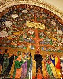 Another type of secular colonial painting is called casta paintings referring to the depiction of racial hierarchy racially in eighteenth-century New Spain. Some were likely commissioned by Spanish functionaries as souvenirs of Mexico. A number of artists of the era created casta paintings, including Miguel Cabrera, José de Ibarra, Juan Patricio Morlete Ruiz, Francisco Clapera, and Luis de Mena, but most casta paintings are unsigned. Ibarra, Morlete, and possibly Cabrera were of mixed race and born outside Mexico City.[37] Mena's only known casta painting links the Virgin of Guadalupe and the casta system, as well as depictions of fruits and vegetables and scenes of everyday life in mideighteenth-century Mexico. It is one of the most-reproduced examples of casta paintings, one of the small number that show the casta system on a single canvas rather than up to 16 separate paintings. It is unique in uniting the thoroughly secular genre of casta painting with a depiction of the Virgin of Guadalupe.[38] Production of these paintings stopped after the Mexican War of Independence, when legal racial categories were repudiated in independent Mexico. Until the run-up to the 500th anniversary of the Columbus's 1492 voyage, casta paintings were of little or no interest, even to art historians, but scholars began systematically studying them as a genre.[39][40][41]