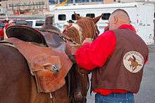 A mochila (Spanish,[1] pronounced [mo-chee-lah], for "knapsack", "pack", "pouch") is a removable lightweight leather cover put over a horse's saddle. In the nineteenth century, it was used as a mail bag by the Pony Express. The eighth-of-an-inch leather cover draped over the saddle on a horse. There were slits cut into the leather which allowed the saddle horn and cantle to protrude through.[2]