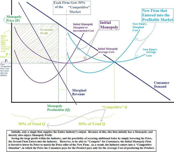 The diagram to the right depicts an industry that initially starts out with a single firm that enjoys a monopoly and the initial monopoly profit that comes with it. Later, a second firm enters into the industry, lowering its price to obtain customers that usually do not purchase the product at the high Monopoly Price. As the initial monopoly firm loses customers, it is forced to lower its price to retain profitability. In the competition for sales to customers, the firms lower their prices even further, which increases the consumer demand for the product, and thereby entices the firms to raise production and which then increases the industry's total production and sales. Finally, the price and production in the industry stabilizes into its "competitive equilibrium"; the price paid by the consumers are just high enough to cover the average economic cost of producing the product, and the available quantity of the product doubles from its initial sales (under the monopoly).