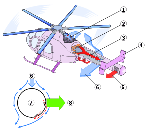 NOTAR (no tail rotor) is the name of a helicopter system which avoids the use of a tail rotor. It was developed by McDonnell Douglas Helicopter Systems (through their acquisition of Hughes Helicopters). The system uses a fan inside the tailboom to build a high volume of low-pressure air, which exits through two slots and creates a boundary layer flow of air along the tailboom utilizing the Coandă effect. The boundary layer changes the direction of airflow around the tailboom, creating thrust opposite the motion imparted to the fuselage by the torque effect of the main rotor. Directional yaw control is gained through a vented, rotating drum at the end of the tailboom, called the direct jet thruster. Advocates of NOTAR believe the system offers quieter and safer operation.[1]