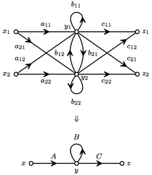 This system could be modeled as scalar signal-flow graph with multiple inputs and outputs. But, the variables naturally fall into layers, which can be collected into vectors x=(x1,x2)t y=(y1,y2)t and z=(z1,z2)t. This results in much simpler matrix signal-flow graph as shown in the figure at the top of the article.
