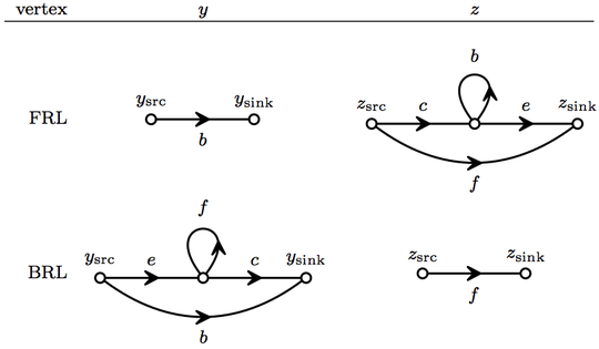 Along path (e,a), FRL and BRL differ slightly, each having distinct splits of vertices y and z as shown in the following table.