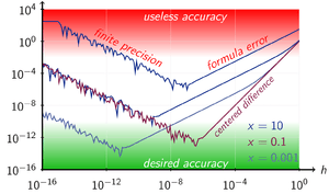 This epsilon is for double precision (64-bit) variables: such calculations in single precision are rarely useful. The resulting value is unlikely to be a "round" number in binary, so it is important to realise that although x is a machine-representable number, x + h almost certainly will not be. This means that x + h will be changed (via rounding or truncation) to a nearby machine-representable number, with the consequence that (x + h) - x will not equal h; the two function evaluations will not be exactly h apart. In this regard, since most decimal fractions are recurring sequences in binary (just as 1/3 is in decimal) a seemingly round step such as h = 0.1 will not be a round number in binary; it is 0.000110011001100... A possible approach is as follows: